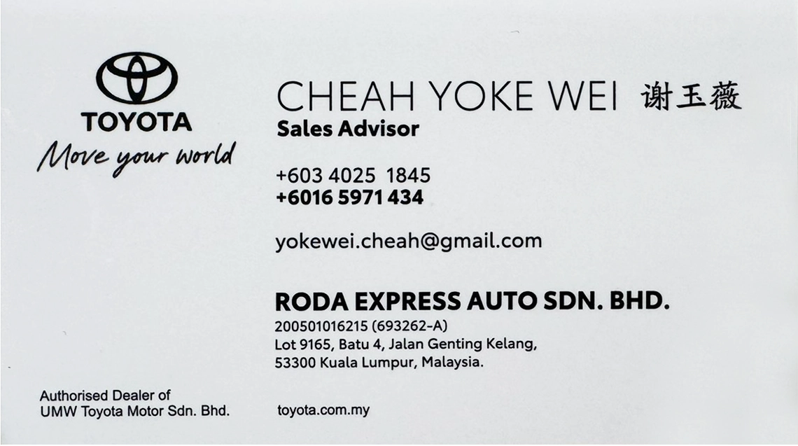 Hi! I’m Ms. Cheah, certified and registered Toyota Sales Advisor based in Setapak, with over 14 years of proven experience in the automotive industry. I specialize in helping customers across Kuala Lumpur and the rest of Peninsular Malaysia find and own their perfect Toyota car.